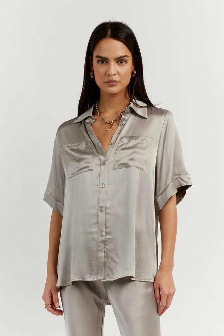 Buy ๐ DISSH Boutiques CLOTHING SIMONE PEWTER SATIN VACATION ๐ SHIRT ๐ฏ